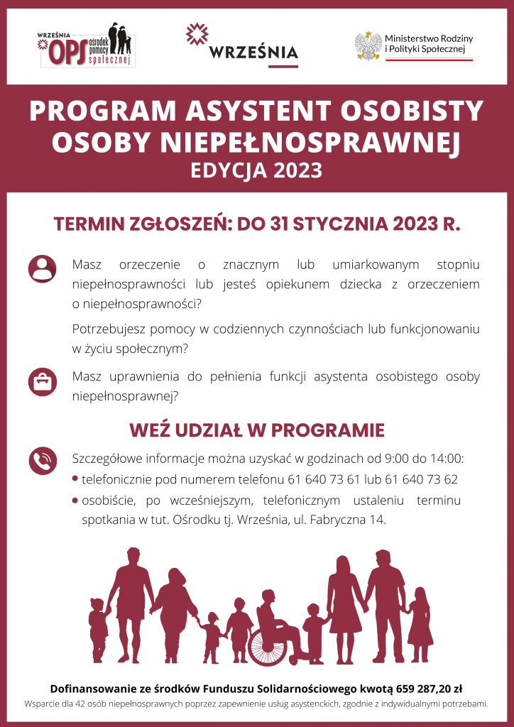 Ośrodek Pomocy Społecznej we Wrześni realizuje Program „Asystent osobisty osoby niepełnosprawnej – edycja 2023”. Zadanie jest finansowane w ramach programu Ministerstwa Rodziny i Polityki Społecznej ze środków Państwowego Funduszu Celowego – Funduszu Solidarnościowego.
