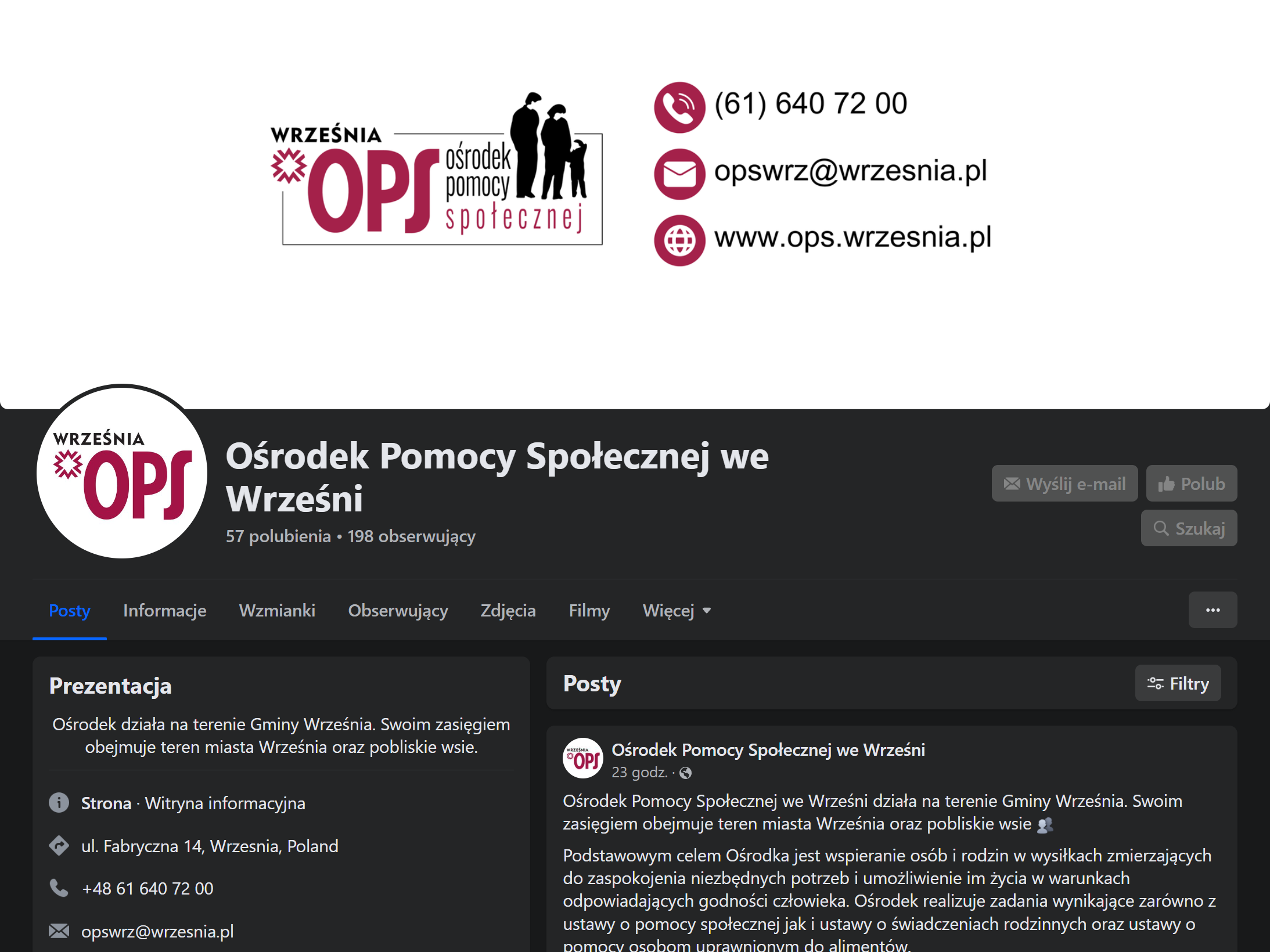 Strona na Facebooku Ośrodka Pomocy Społecznej we Wrześni Strona na Facebooku Ośrodka Pomocy Społecznej we Wrześni – LINK Powiązane wpisy 11 października 2024Projekt „Integracja na start!” nr FEWP.06.12-IP.01-0117/23Czytaj dalej